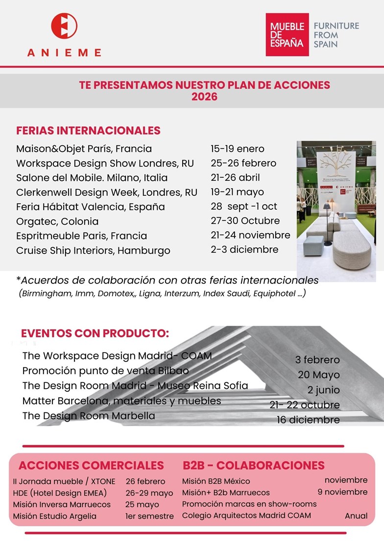 En ANIEME ya tenemos grandes avances en cuanto a la planificación del 2026. Queremos compartir con nuestras empresas las acciones y servicios que estamos organizando para los fabricantes de muebles y hábitat de toda España, tras recopilar sus opiniones y explorar diversos mercados, ferias y actividades desarrolladas en 2025. Todas estas propuestas son dinámicas y pueden sufrir modificaciones conforme pasen los meses, pero os las mostramos ya para que podáis planificar y sacar el máximo partido de ellas. Durante el año iremos comunicando actualizaciones y posibles incorporaciones y cierres de fechas pendientes.
